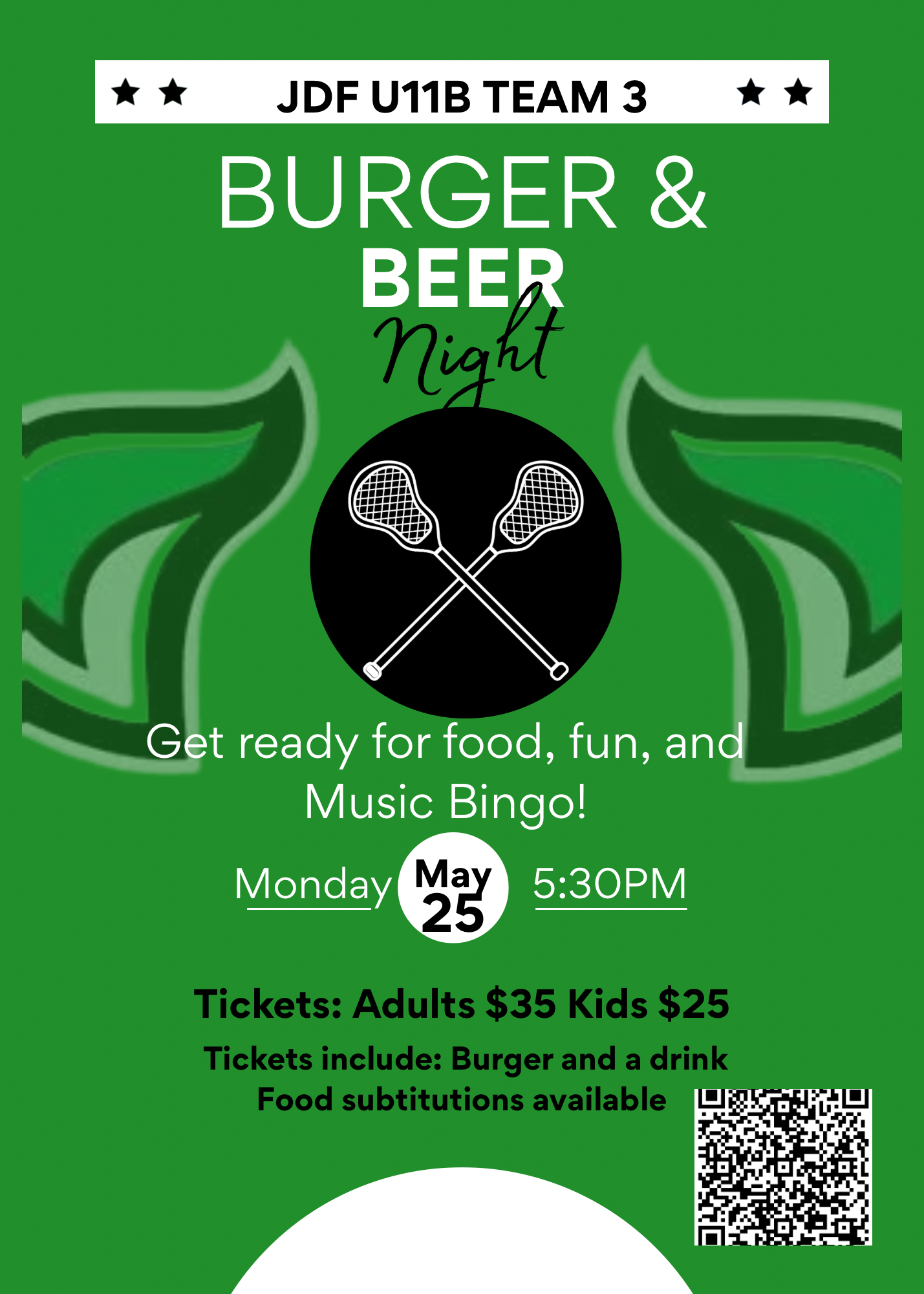 Join us for a Burger & Beer Fundraiser Night for our U11 B Team 3!! This is a family friendly event that includes a beef or black bean burger, served with your choice of beer, cider or a non alcoholic beverage. Substitutions for kid tickets can be made with a choice of chicken strips or mac & cheese.
